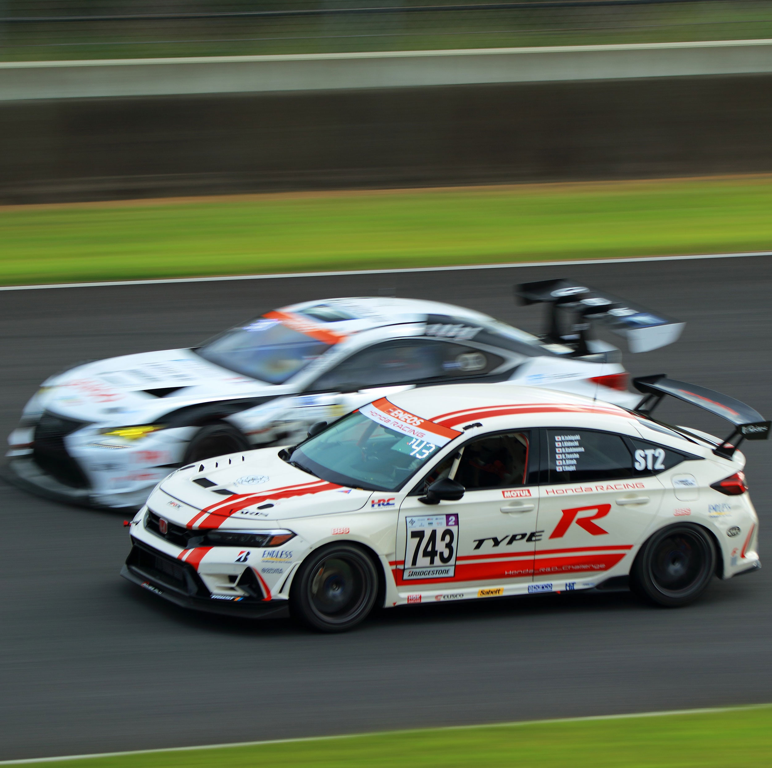 疾走する車両の流し撮りがきまった写真です。 追い越しをかけている車両のブレが流し撮りの臨場感を増しています。 複数クラスが混走するスーパー耐久レースらしさを感じました。