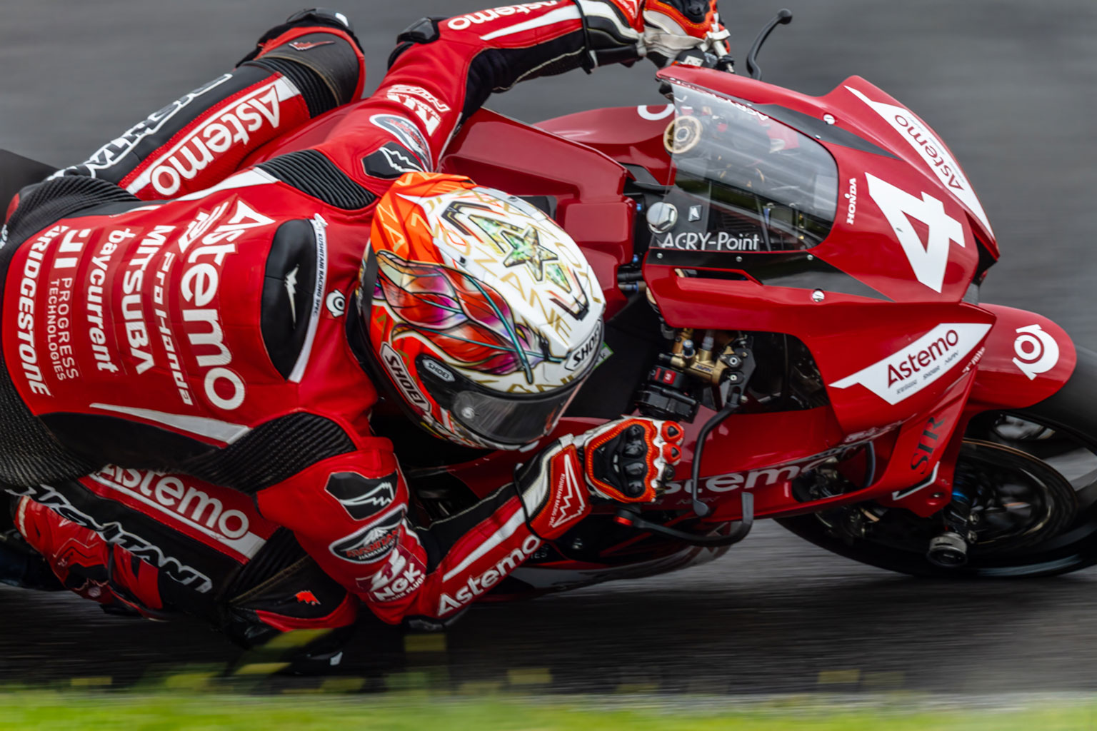 中須賀選手が力走を支えてくれたマシンに感謝を伝えているような、レース後のほっこりするひとコマをとらえた写真です。 中須賀選手のバイク愛が伝わってきました。