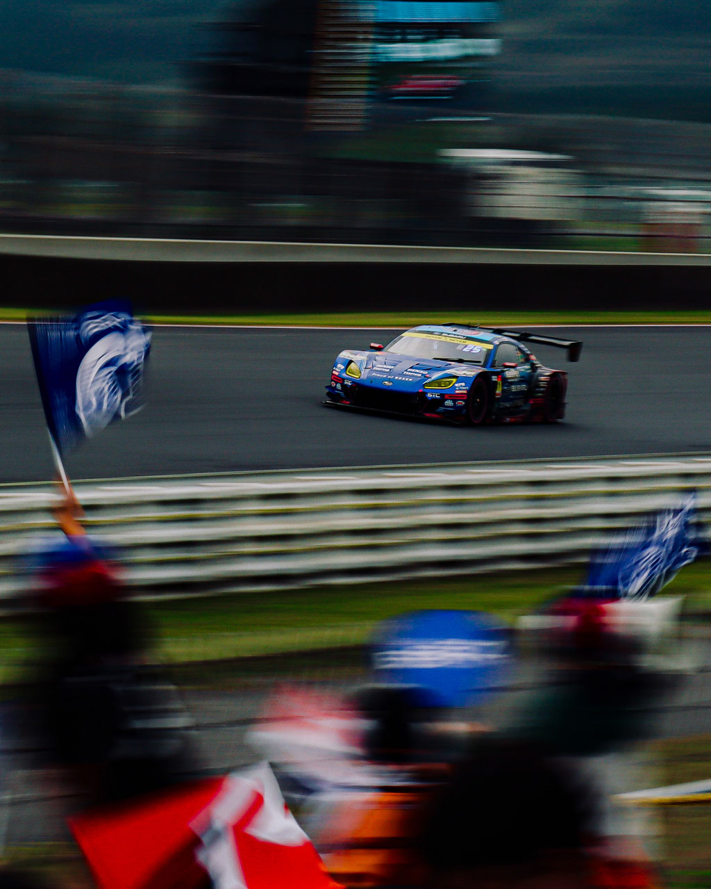 スバルを応援するファンとBRZ車両の重なりを絶妙なタイミングでとらえた流し撮り写真です。スピード感と応援旗をふるファンのブレ具合に臨場感を感じました。