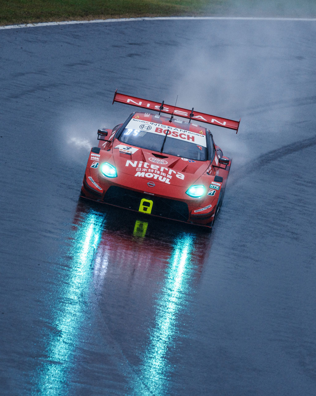 雨天となり濡れた路面に反射するヘッドライトを正面からとらえ、長く伸びる光のライン、巻き上がる水煙にGTマシンの存在感とかっこよさを感じました