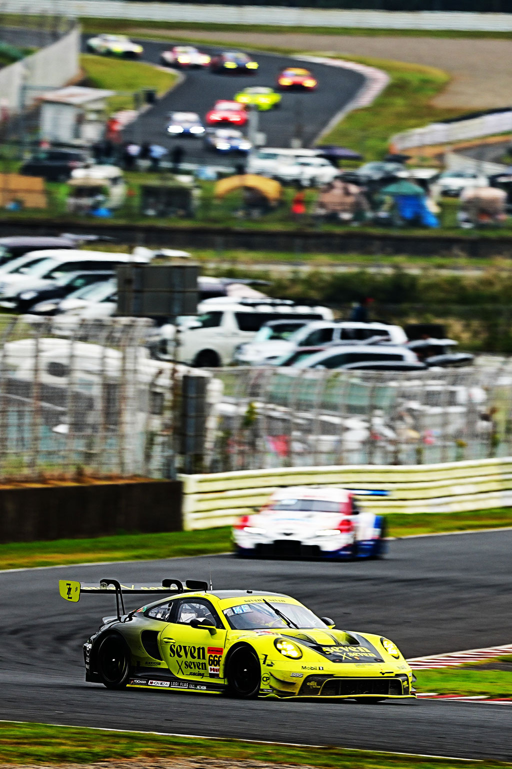 GT300クラス初優勝を飾った666号車。 非常に奥行きの有る縦画面で、第2ヘアピンを通過中の主役を手前に配し、駐車場やキャンプエリア越しに第3コーナーの車列までバラエティに富んだ賑やかな作品になりました。
