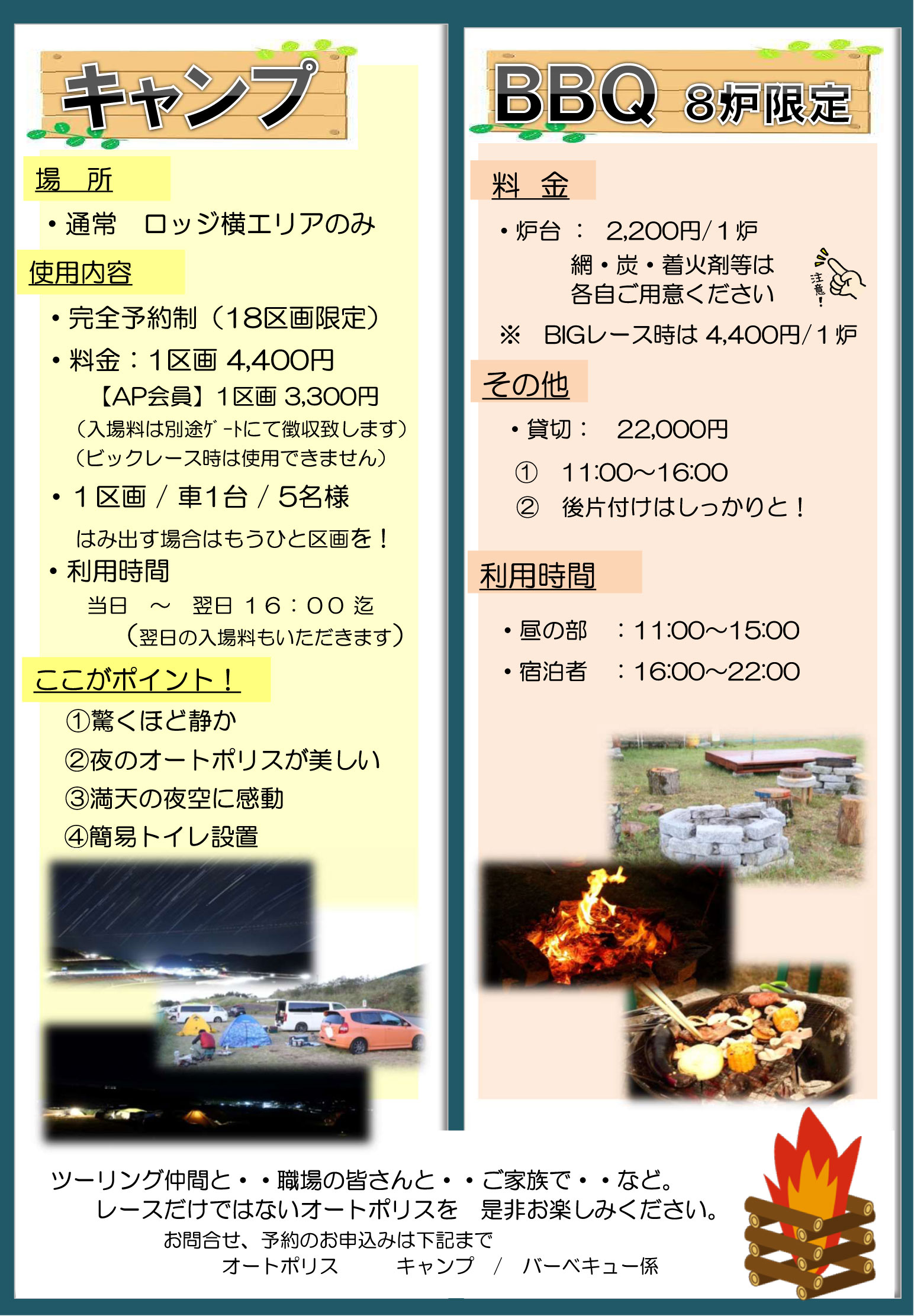 キャンプエリア、バーベキューエリア ツーリング仲間と・・職場の皆さんと・・ご家族で・・など。 レースだけではないオートポリスを 是非お楽しみください。 TOPICS 料金改定についてのお知らせ(2026年4月より)