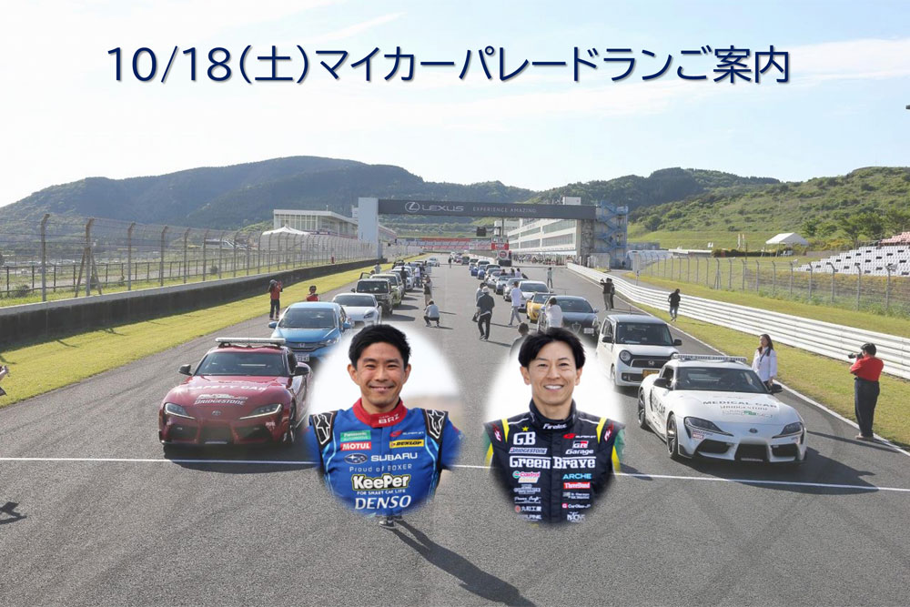 公式予選の興奮が残るオートポリス インターナショナルレーシングコースをマイカーで走りませんか? 今年のマイカーパレードランは、GT300 クラスで大活躍中の井口卓人選手と吉田広樹選手が先導します!!一緒に記念写真も撮ろう!!