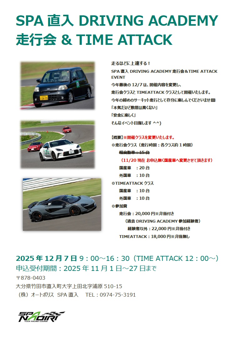 2024年からは、装いも新たに「SPA直入 DRIVING ACADEMY&TIME ATTACK EVENT」と題し、スクールと同時開催でタイムアタックイベントを併催します。変わらず、レース経験豊富なアドバイザーが運転のノウハウや車両セッティングなどを丁寧に指導いたしますのでお気軽にご参加ください。