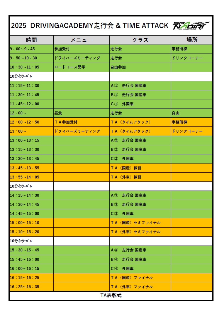 | 開催日 | 走行会 国産車(軽自動車以外) | 走行会 外国車 | 国産車TIME ATTACK | 外国車TIME ATTACK | |